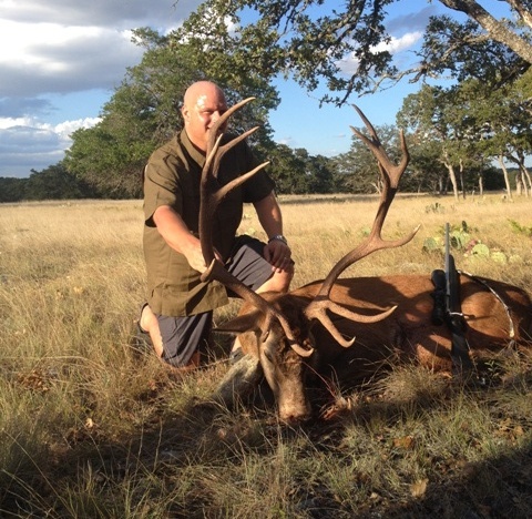 I was very fortunate to be Red Stag hunting with Doug and a group of his clients from LGI. We booked the hunt originally for 4-5 Red Stag and one other hunter would decide what he wanted along the way. On the first day we had some close encounters early and just couldn’t make it happen. As the day went on we were able to find the above Red Stag bedded down with a smaller Red Stag and Bryan made a great shot and put this nice stag on the ground. We had a little bit of daylight left and wanted to try to get one more Red Stag Bull down so we continued on safari style and finally had a Red Stag Bull run across in front of us and stop in some trees about a hundred and fifty yards away. Parker was up to shoot and made what we thought was a good shot and couldn’t connect on the second shot. We gave the Red Stag a few minutes and then went in on foot looking for the blood trail. We found some blood and followed it for a while and it just got dark on us and the blood trail was very spotty. I quickly got to service and made some phone calls to try to find a tracking dog that might be available to come work this trail for us but to no avail. Everyone was either out of town or had sold their dog or just couldn’t make it out. So we figured we would come back the next morning early and scour the area and find the Red Stag. We arrived back on the scene early the next day and everyone started looking and we scoured a good portion of the pasture with no luck. We figured this Red Stag bull might still be alive and we would possibly jump him sometime during the day or we might have help from the buzzards as it warmed up. So with more hunters ready for their chance to go after their Red Stag we continued on the hunt. This portion of the 2nd day became what got referred to as “nascar hunting” !! with the animals pretty stirred up from 2 shots the previous evening I knew we would have to try to run the Red Stag out of the trees and into some open country. Joe was up to shoot and we couldn’t get a red stag to stay still long enough for him to get a shot until we finally had a couple Red Stag Bulls break from the herd and stop on a ridge at about 60 Yards! We quickly evaluated the Stag and we told Joe this heavy horned brute would make a great trophy. Joe let the 300 win mag do the job and 1 shot his stag ran about 40 yards and fell. Joe had found a little trouble shooting on a previous hunt but had no problems taking down this big Red Stag.