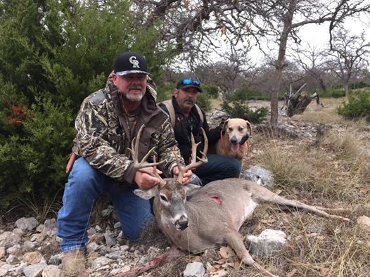 We had Dave down for the first weekend of 2015 last weekend of Whitetail Buck season here on Forister Exotics. We had a game plan to look for a Big 8 or 12 point we had been seeing in a feed location on a regular basis. I got Dave and his son set up in a pop-up blind and fed the setup pretty heavy knowing they where soon to be covered in Animals. I retreated to a high spot to watch the mornings events unfold. As light finally began to creep up on the horizon I could make out a big whitetail buck eating in the middle of the set up. As I waited for a shot I began to tell myself man he better shoot or the 100 animals in the area are going to clean him out and the morning hunt is going to be over. The Buck began to make his way out of the location and finally I hear a shot wring out but from my vantage point I did not see any reaction from the deer so I could tell it was a miss. I figured I better go get them and we could try to track the buck down and try to get another shot. I decided to give it a few minutes and I finally decided to go when I reached up to crank the truck I caught movement off the side of the feed location. No way… I remember telling myself, there’s no way that smart old buck is going to come back for another round! Sure enough here he came back into the corn. This time he proceeded to walk in at 60 yards and make his way directly toward the blind and give the hunter a 30 yard shot. He wouldn’t turn so Dave had to take a front on shot which at that distance should have been quite fine. As the deer trotted away his leg was showing serious damage and we figured he would be down just off the ridge. Once we hit blood we thought we would be in for a short track and we’d have our deer. Well 3 hours later my Friend from BloodTracker Jeff showed up with Taz and we where off on the track job again. After a few minutes we found the blood Taz was on and knew he was on the right track. A few minutes later we see Taz bouncing around a clump of Cedar like a quail dog when he knows the cuvvy is close but just cant quite find them! All of a sudden all hell breaks loose and we are following Taz down into a canyon at a full sprint with the whitetail buck in the lead. As we got to the bottom Taz had this buck bayed up and with no hunter in sight Jeff made the decision to end it with his trusty spear before his dog go the business end of this 12 point up close and personal. Ended up the bullet went in between the shoulder and the body cavity and exited behind the shoulder never hitting any of the vitals. As everyone made their way down to the scene we got the Whitetail buck posed and snapped a few shots with Dave, his awesome 12 point whitetail and Jeff and Taz jumped in to. I did a writeup on Bloodtracker earlier this year and if any of you used Jeff this fall you know what kind of dog he has. Anybody who was fortunate enough not to have to call Jeff just keep that number in your phone for the dreaded day because he is sure to turn your day around thanks again Jeff. It Is a thing of beauty to watch a good dog work and do the job he is bred and trained to do. I know he made Dave’s day a little brighter. Congrats Dave on a great Whitetail Buck and cant wait to have you guys back for spring Turkey.