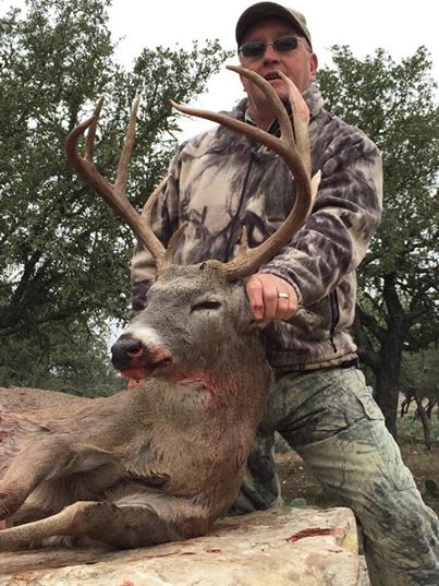 Dave had been down a few times in 2014 and made a trip back to finish out the year bringing a couple of his friends to join him on a late season Whitetail hunt at Forister Exotics. We started out stand hunting and George was after a nice 130 class whitetail buck.  We hunted hard for 3 days seeing a ton of whitetail bucks just not one he was ready to fill his tag on until the last evening. George and Dave where sitting together in the stand and as darkness started to creep in a good whitetail buck made his way into the stand. Both hunters having hunted most of their lives knew it was getting late and this was for sure the best Whitetail that had come in front of them in 2 days but both hunters knew this deer might be a little to big. With it being the last night of the hunt the guys figured they better decide quickly and decided this would be Georges whitetail buck. After picking up and putting the gun down 3-4 times in the deciding process George finally lifted it 1 more time. With shooting light fading George made a good shot and the deer didn’t make it 20 yards. George and Dave made their way down to the deer to find a heck of a 10 point whitetail buck laying dead George told Dave ” I think we might be in trouble”. I had made my way to the gate to the pasture they where hunting and stopped and told myself give them 5 more minutes and thankfully I did. Once we measured the deer we found out they had a 1/4 inch to spare. Congrats George on a great whitetail deer!