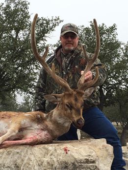 Dave had come to Texas with Dave and George and wanted to take a nice Axis Buck. I had been seeing a couple Axis Bucks that where hard horned and a couple Axis Bucks in Velvet. So we sat Dave in a popup blind over a watering hole and feed location. It took a couple of days of playing cat and mouse and seeing the big Velvet Axis buck skirt the stand and not give Dave a shot but the same night George got his whitetail The big Velvet horned Axis Buck made his way into the feed and Dave made a good shot and had an Awesome Axis Buck down. Congrats Dave on an excellent Axis Buck.