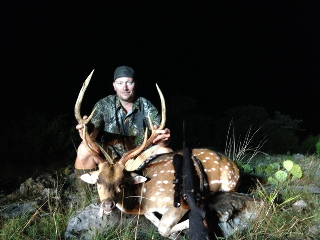 Friday night we had some heavy rain through the night and early morning hours so everyone stayed in camp and slept in after a late night. After breakfast the guys went back into the pasture in search of more Axis Deer. Through the day we ended up getting a couple Axis Doe and shot at a couple bucks with no hits. As the evening winded down we spotted a good Axis buck and Chace put the wood to him. Great shot on a moving target. As we were headed in T-boy Chases dad redeemed himself and made a nice Texas heart shot on a good Axis Buck. Over all a pretty good weekend and some nice Axis Bucks taken. Forister Exotics can’t wait to have the Houston Controls guys back in November! Congrats guys on some great animals!